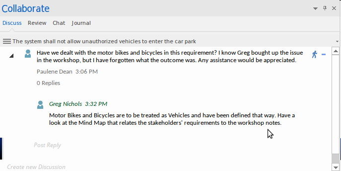 While Enterprise Architect is highly compliant with the SysML specification it has a number of collaborative features that allow such comments to be managed, such as through its Discussion feature. This allows discussions to be kept separate from the elements proper that comprise the model. This screen image shows the same comment added using the Discussion feature, which allows replies and a range of other collaborative devices.