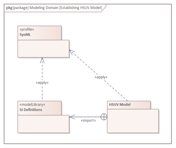 As shown in this diagram, the HSUV Model is a Package that represents the user model. The SysML Profile is applied to this Package in order to include stereotypes from the profile. The HSUVModel might also require model libraries, such as the SI Units Types model library. The model libraries are imported into the user model as indicated.