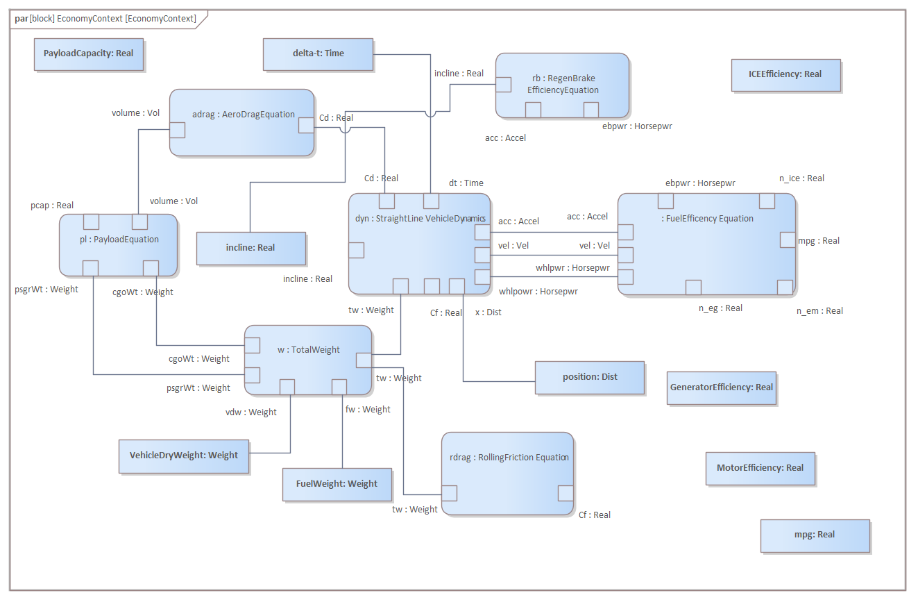 This Parametric diagram is used to model the fuel economy as it has been defined as an important high level requirement for the SUV and so needs to be assessed to ensure the final product will perform adequately. The Parametric diagram contains constraint properties (instances of the constraint blocks). There are a number of equations that contribute to the evaluation of the overall economy including: Aero Drag Equation, Regenerative Break Efficiency Equation, Straight Line Vehicle Dynamics, Rolling Friction equation and the Fuel Efficiency equation. The constraint properties contain boundary mounted parameters that are connected to other parameters by binding connectors.