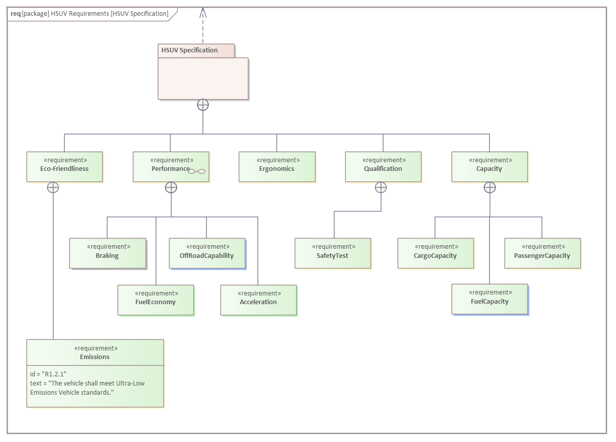 This diagram demonstrates the visualization of requirements in a hierarchy using the containment (cross-hatch) connector to show the parent child relationship. The higher level requirements act as a type of grouping or containment system and cover a range of high level concerns which are broken down into lower level and presumably measurable statements.