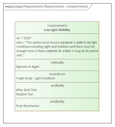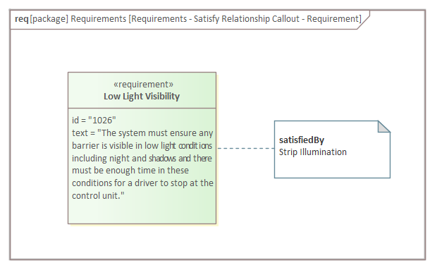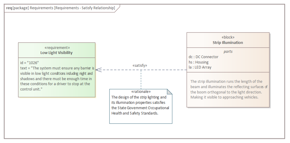 The relationship drawn between two elements visible in a diagram is the most common way to visualize Requirement relationships; the dashed line is drawn from the client (the dependent element) to the supplier (the providing element). So in this example the 'Strip Illumination' Block is the client and it depends on the 'Low Light Visibility' Requirement, so the arrow points from the Block (client) to the Requirement (supplier).