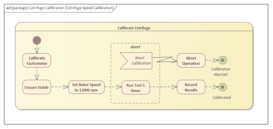 In this diagram, an engineer has modeled the process used for performing a speed calibration for a centrifuge. The centrifuge calibration process can be interrupted for various reasons; for example, if the centrifuge has become unstable or the operator is called away to perform other duties. An Accept Event Action is used to show that the Activity has a mechanism to listen for a required interruption within a specified Region of the Activity. The special Interrupt Flow connector then targets an Action outside the Region, which is used to shut down the centrifuge; finally this flows to the calibration Activity being terminated.