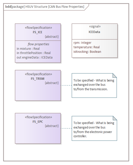 This diagram shows the first (unfinished) steps in the definition and refinement of a bus architecture. The modeler has used flow specifications to model the way that items will flow though the vehicle; for example, a flow specification has been defined for: