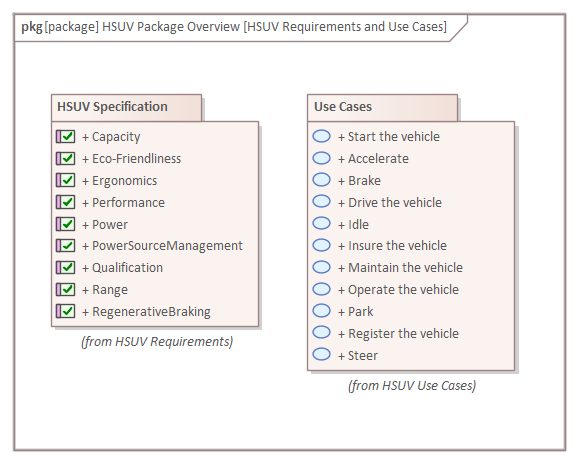 As with all SysML elements, there is both a graphical and textual aspect to the elements, notes can be added to each of the Packages and the relationships to clarify the purpose of the element or the connector. The Package diagram can contain any type of model element but typically it contains Packages. Enterprise Architect extends the SysML specification by providing a number of different and innovative ways to visualize Packages and their content on a Package diagram. These options can be seen in the menu that is displayed when a Package is dragged from the Browser window onto a diagram.