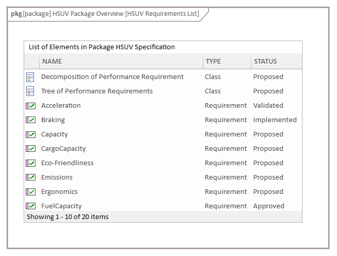 In the next diagram the engineer has chosen the 'Package as List' option, which relies upon auto-generated but user-configurable SQL code to create a dynamic list of elements based on any of the Package element's metadata. Here we see the same list of requirements but this time a number of properties are also displayed.
