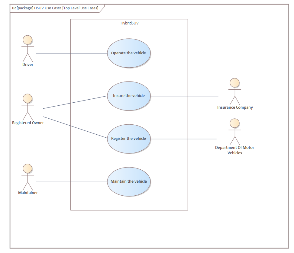 The Subject (boundary) provides a context for the definition and represents a system or part of a system; the Actors by definition lie outside the Subject and the Use Cases within. The Communication Path relationship by definition crosses the perimeter of the Subject as it connects an Actor with a Use Case. Again, the number of relationships is quite limited, but each has specific meaning in the diagram.