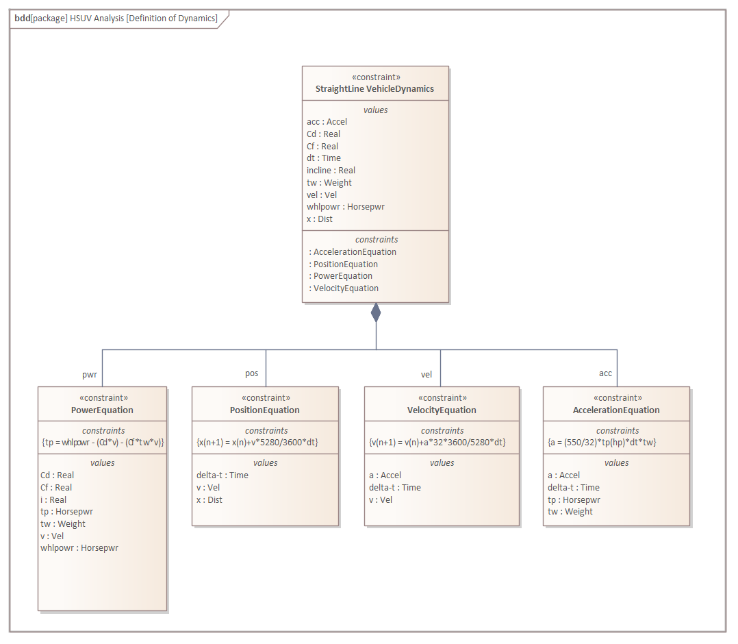 This Block Definition diagram describes parameters of the straight line dynamics of a vehicle - the HSUV - and includes a number of equations that are represented on the diagram as Constraints, which are a type of Block.