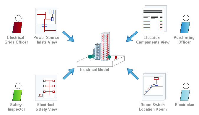 The electrical model of the building is useful to a number of different stakeholders, all of whom have a different viewpoint with respect to the system, including the Electrical Grid Officer, the Safety Inspector, the Electrician and the Purchasing officer.