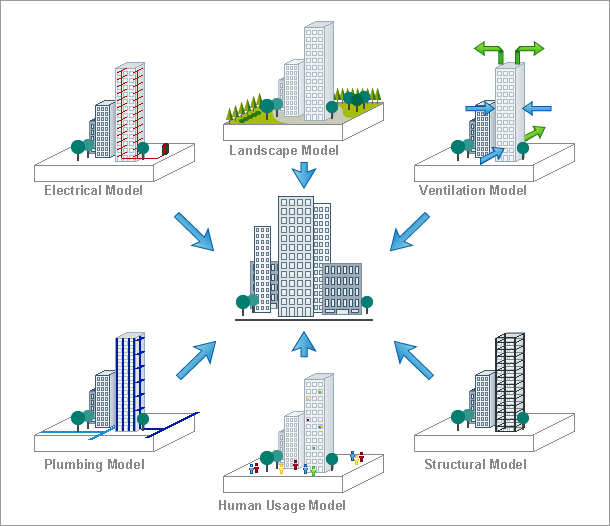 By constructing a number of models we are able to create a simplified view of each of the subsystems, which makes it easier to understand that aspect of the building. The models themselves also need to be resolved against each other. For example, it is critical that the power system represented in the electrical model provide electricity to the air-conditioning equipment modeled in the ventilation system. The Human Usage model needs to be resolved against the Landscape model to ensure that the gardens and landscaping meet the recreational needs of the occupants and their visitors.