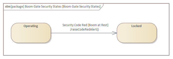 This diagram illustrates the way the Trigger, Guard and Effect are displayed on a diagram. The Effect in this case has been defined as a behavior and has been linked to an Operation defined on the Block.