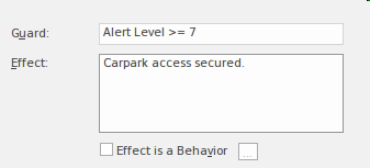 A guard's expression can be defined in plain English, but typically it is written in the form of a constraint using a formal constraint language such as the Object Constraint Language. When working with simulations or Executable StateMachines the condition is expressed in the syntax of the code language that it is to be generated in, for example JavaScript or C++. This also applies to Effects. In this diagram we can see a mathematical expression that can be evaluated by a human or a machine.