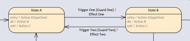 The transitions always originate from one State and target another, including the special case of a self-transition where the origin and the target are one and the same. The lines in the diagram have a label that can display a number of different options: Trigger, Guard and Effect. We will discuss these options in detail because they express important semantics about the transitions, including whether the transition will be executed at all.  A transition can be in three conditions: