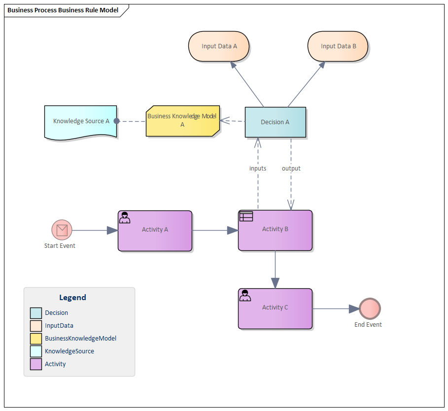 The Business Rule Task was added into the later versions of the BPMN specification to allow any Business Rules engine to be called at a specified point in a Business Process, and for the engine to return a result to the process once the request had been processed. It is this mechanism that can be used to integrate Decision Models with Business Processes, thus providing a syntactical mechanism to keep these quite different concerns separate from each other. Enterprise Architect is a rich modeling platform, and it not only allows both types of models to be created but also permits them to be visualized on the same diagram.