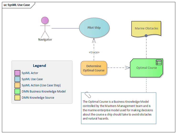 The SysML Use Case can be used to describe a goal a user is trying to achieve by using the system. The Use Case can be described using a series of steps typically creating a backward and forward interaction between the user and the system. The steps the system performs often require decisions to be made and these can be modeled using a Decision Model. Consider a Use Case that describes an aspect of a Ship's navigation System. A step in a Use case could be 'The system decides on the optimal course and way points'. There would typically be a number of inputs into this decision which could be conveniently recorded in a Decision Model.