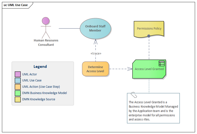 The UML Activity diagram is a close (but older) cousin of the BPMN Business Process diagram and uses similar notation and semantics. Traditionally, decision logic has been intertwined with process flows using Decisions, Merges, Forks and Joins to describe the choices and conditions under which decisions are made. This has lead to complex and often unwieldy Process diagrams. Using the DMN, the decisions (including their logic) can be removed from the diagram and placed in a Decision Model. This has the effect of simplifying the diagrams, resulting in straight-through process flows and a model where decisions can be reasoned about, easily changed, and also generated to implementation code.