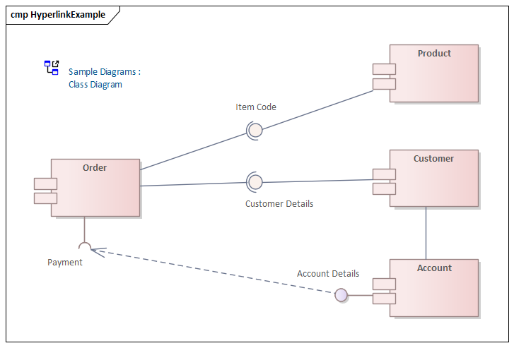 Assembly connectors connect the provided interfaces supplied by Product and Customer to the required interfaces specified by Order. A Dependency relationship maps a customer's associated account details to the required interface Payment, also specified by Order.