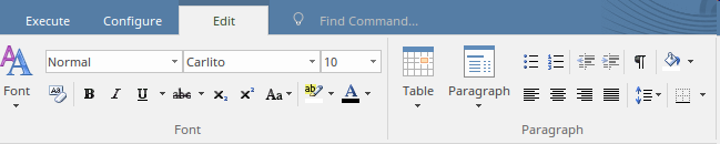 You can create Static content by typing or pasting text directly into the document and applying styles and formatting. Enterprise Architect has a fully-featured document editor that helps you to enter and manage Static content in the document. The editor facilities are available through the Document - Edit ribbon, which is automatically enabled when a document is open in the workspace. This image shows some of the formatting options available from the ribbon.