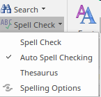 When working with both Static and Dynamic content you can configure Enterprise Architect to auto spell-check, and you can also use an inbuilt thesaurus to find alternative words to make your document richer. Spelling can be configured by setting a number of options available from the Document - Edit ribbon, as illustrated by this image.