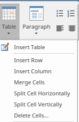 Just as if you were using your favorite word processor, you can insert tables and format them to suit the content, including adding rows and columns, and changing border style and cell spacing. These tables could be used in the document preamble for sections such as versions of the document, or audience, or in the body of the document. This image shows some of the options for working with tables.