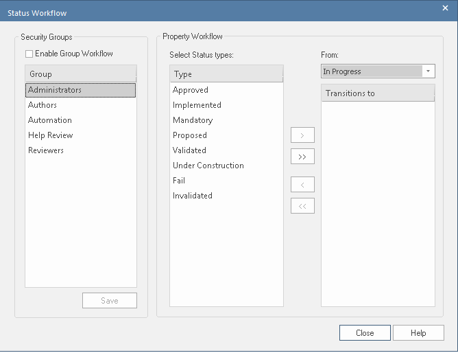 In the 'Type' panel, click on the value that the users can change the status to, and then click on the You can transfer all values to the 'Transitions to' panel by clicking on the If you need to correct or otherwise remove values from the 'Transitions to' panel, use one of these two buttons: ![]() As an example, if you wanted to allow Reviewers to transition elements from 'Implemented' to 'Reviewed' or 'In Progress', you would select 'Implemented' in the 'From' field and click on 'Reviewed' and the |