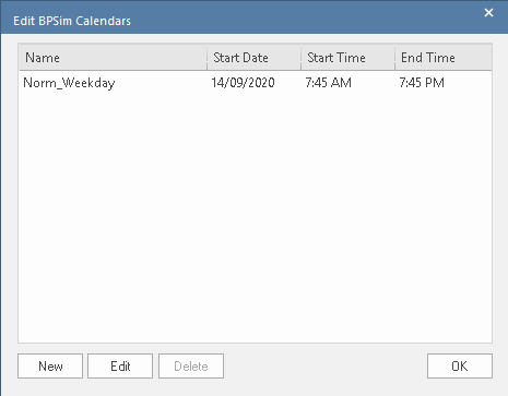 button on the toolbar; the 'Edit BPSim Calendars' dialog displays, showing any existing calendars.