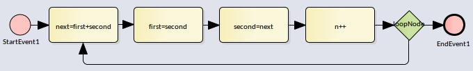 For example, a BPMN process to calculate Fibonacci numbers might be modeled in this way: