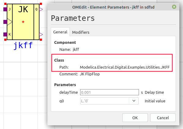 This illustration is an example of a Modelica component (a JK Flip-Flop) and its 'Parameters' dialog, showing the Class-Path.