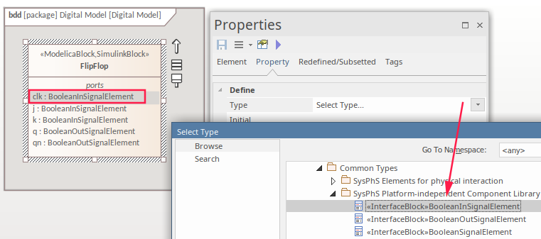 As a starter for all SysPhS models you must ensure that the SysPhS common types are loaded in the repository and referenced in the new model, using the Package Import connector. For more information see the Referencing the SysPhS Simulation Libraries Help Topic. The Value Types used for the Ports are pre-defined in the SysPhS Simulation Libraries. The two key types used are the BooleanInSignal and the BooleanOutSignal ValueTypes. This figure shows the Flip-Flop Block in the Block Definition diagram, with the Clock Port set to the BooleanInSignal ValueType and this being referenced in the Browser window.