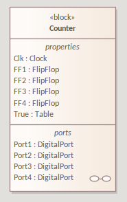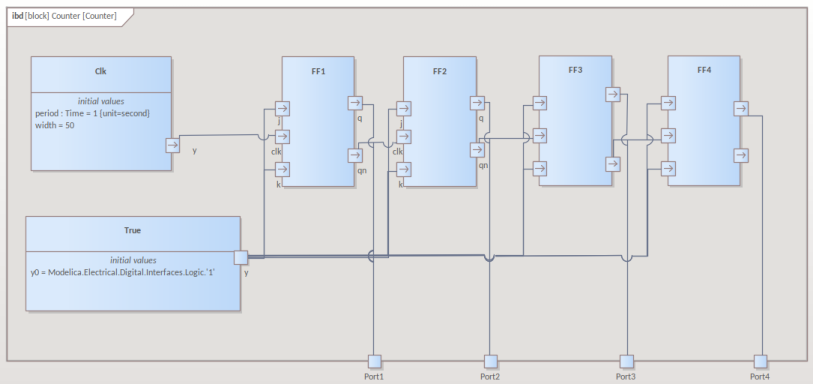 The digital pulse source is a DigitalClock component in Modelica and Simulink. This requires two parameters - 'Period' and 'Width', as shown in the Modelica editor. ![]() The values of these parameters must be set in the IBD Part 'Clk', in the Properties window 'Property' tab, 'Initial' field ![]() The J & K Ports require a fixed logical 'True' state. This is defined using a Table set to 'true' using an initial value, as shown here for Modelica. ![]() On returning to the BDD you should now have the Counter Block shown as: ![]() |