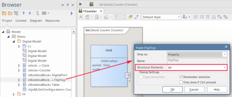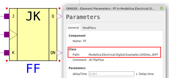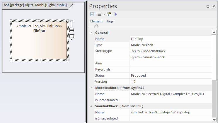 In order to define a Block specific to Modelica or Simulink you need to access the Component's Path in the respective application, then set this in the Block's Properties. For example we can find the Flip-Flop component in Modelica. ![]() We then copy that to the Block's properties. ![]() For more details see the Creating Modelica Specific Blocks and Creating Simulink Specific Blocks Help topics. |