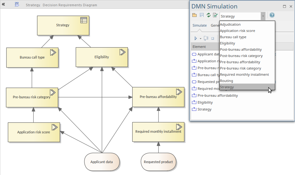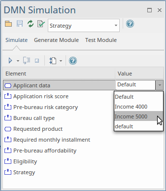 • Double-click to open the DMN Simulation window at the 'Simulate' tab