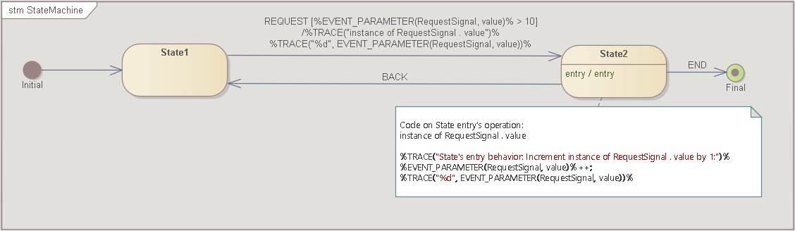 - Transition's guard: %EVENT_PARAMETER(MySignal, bar)% > 10