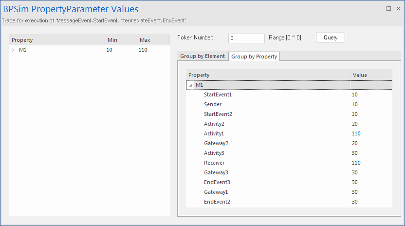 button; the 'Property Parameter Values' dialog displays, tracing the values for properties during simulation - In the 'Token Number' field type '0', then click on the and on the 'Group by Property' tab