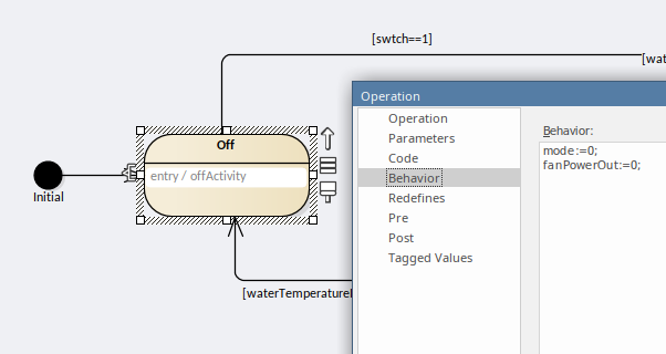 Each of these can contain code, which is defined in the State's Operation under Behavior. For example, this is a code snippet for an Entry: