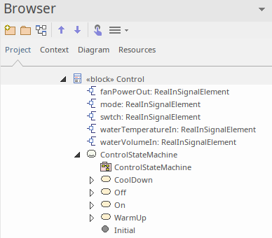 For example, in this case the Block 'Control' has a child StateMachine named 'ControlStateMachine', which has a child StateMachine diagram 'ControlStateMachine':