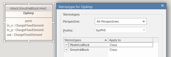 - Tick both the SimulinkBlock and ModelicaBlock stereotypes
