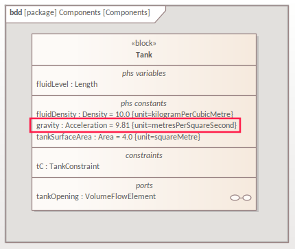 In the example of a tank of water, in which the constant 'Gravity' is defined and is fixed for each tank instance, the value is best placed in the source Block.