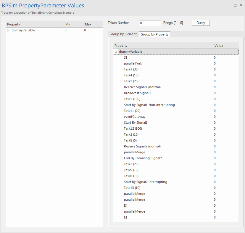 button on the tool bar to display the 'BPSim PropertyParameter Values' dialog - Click on the and on the 'Group by Property' tab, and expand 'dummyVariable'