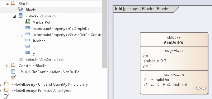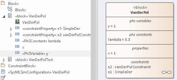 In releases of Enterprise Architect prior to Release 15.2, for each Part/Property the type and options were defined within the Configure SysML Simulation window, opened from the SysMLSim Configuration Artifact. This approach is still valid and available; however, using the latest features of the SysPhS Standard you can now define simulation parameters in the model itself, meaning you can generate to different simulation tools (Simulink and Modelica), from the same model and make adjustments at an elemental level.