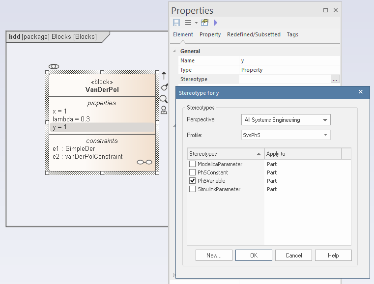 7. Notice also that, in the Properties window, you can see the Stereotype defining the type of the property, and the options for that property type (as Tagged Values) as defined in the SysPhS standard.