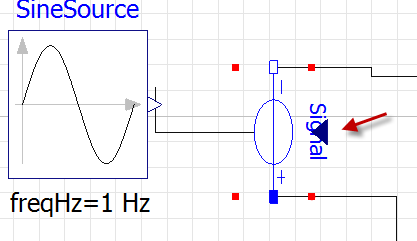 When opening the generated model in Modelica, using the icon on the Toolbar, this is the view showing that the connector is not linked to the triangle that is the import to the Signal object: