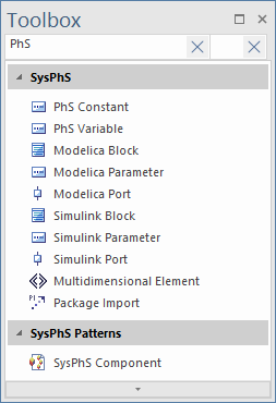 The SysPhS profile provides a dedicated Toolbox page, containing basic SysML elements for both OpenModelica and MATLAB Simulink and, on a 'SysPhS Patterns' page, the 'SysPhS Component' icon.