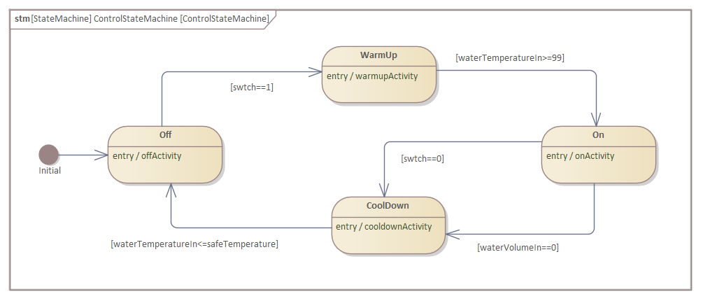 Enterprise Architect will translate a SysML model into the Simulink format and automatically run the simulation, plotting the outputs of the selected variables. The generated Simulink file can also be opened directly in Simulink, allowing modification and fine-tuning of the simulation settings and output functionality.