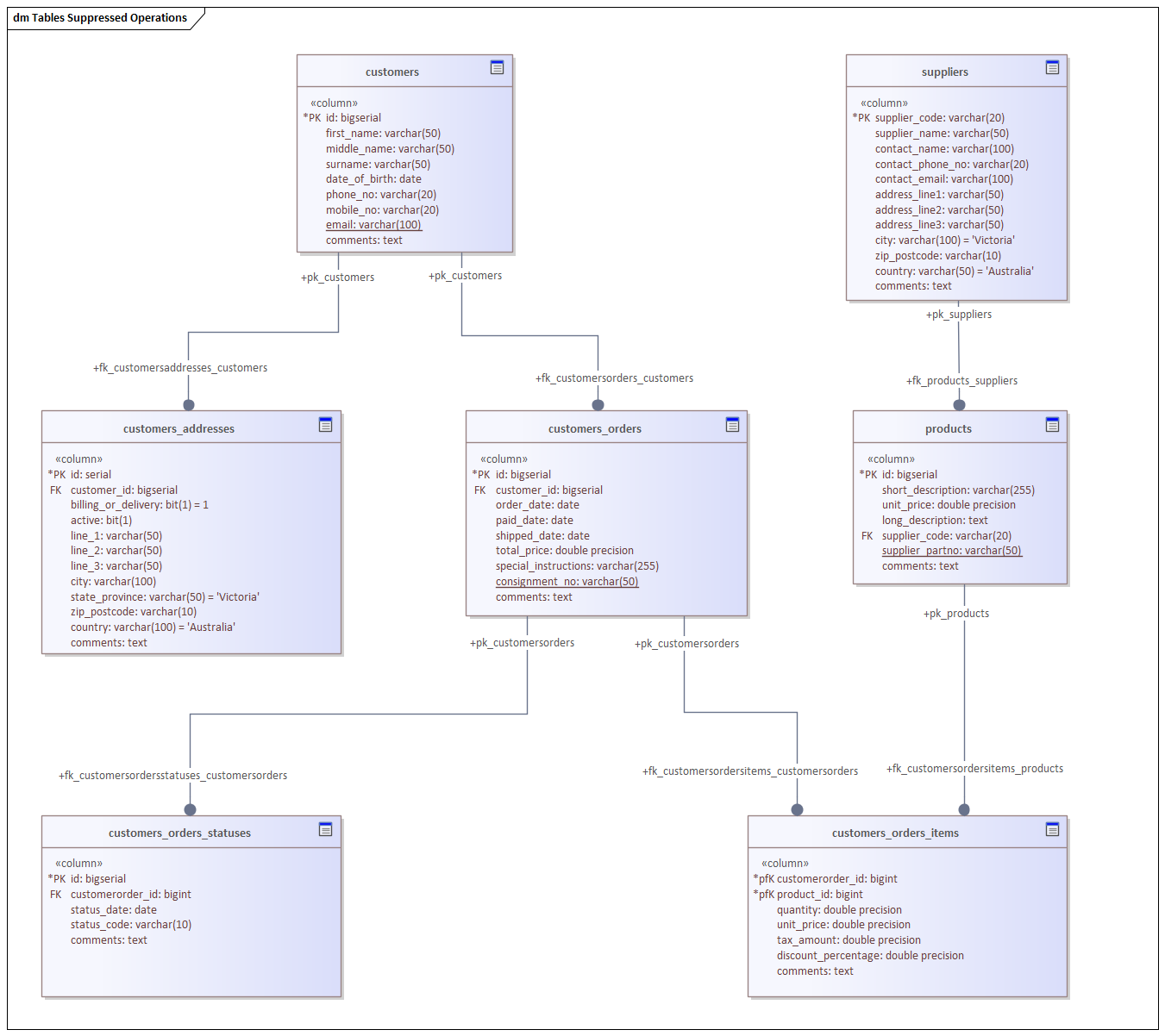 Data modeling diagram with suppressed operation compartment showing tables connected to indicate foreign key relationships.