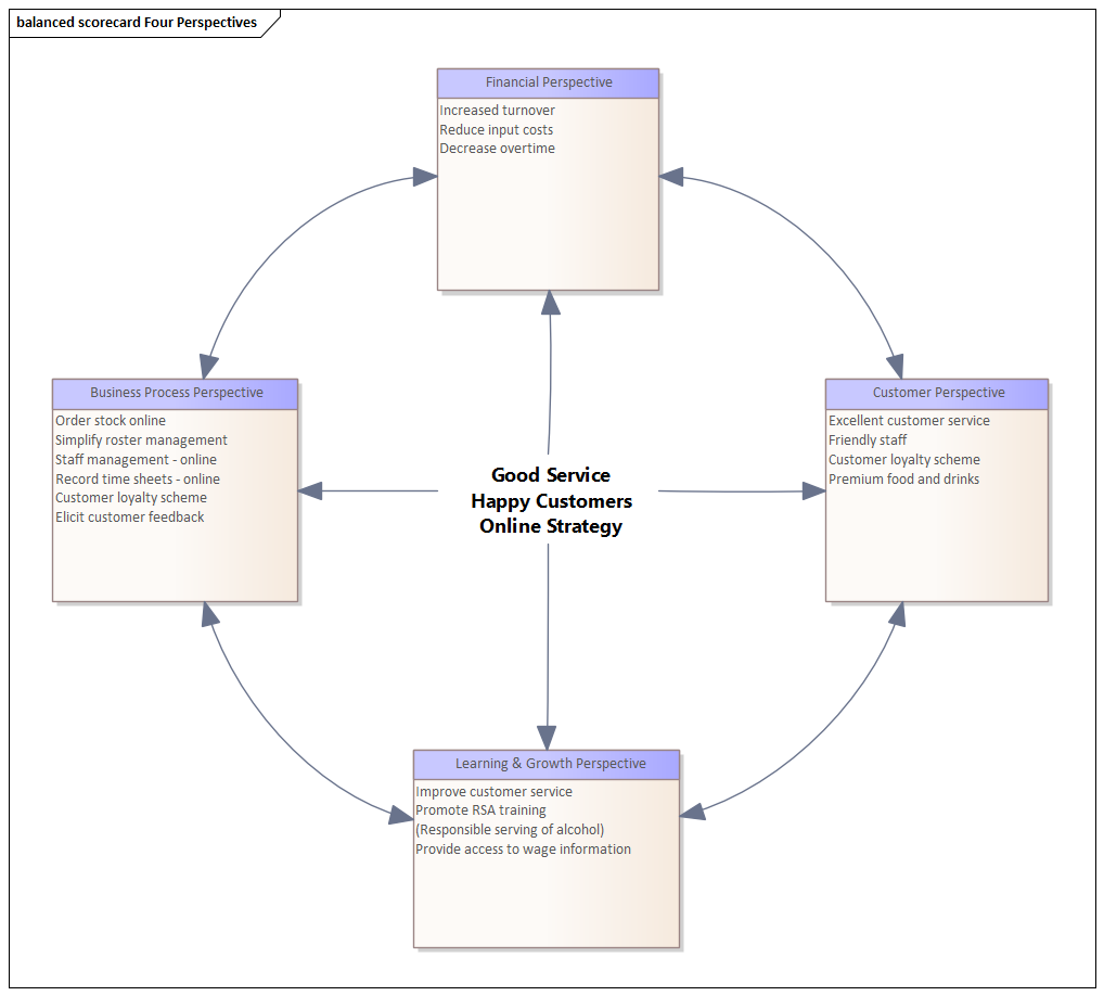 The diagram you have created using this procedure illustrates how the company vision and strategy is directly tied to each of the four perspectives. Resource allocation is based on results and strategy rather than a set of arbitrary financial numbers from the previous financial year. The Balanced Scorecard approach helps to ensure that business activity is engineered to adhere to company values and meet targets. Enterprise Architect allows each perspective to be linked to supporting documentation, model information and rigorous benchmarks that verify whether strategic initiatives have been undertaken and associated targets met.