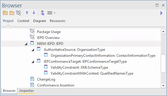 For example, you might create an Object instance of the type IEPConformanceTargetType and nest it within the IEPD Object. In this case, the child Object must be named 'IEPConformanceTarget' to correspond with the attribute of that name in the Class definition. Ensure that the child Object is indeed nested within the parent, by inspecting the hierarchy shown in the Browser window.