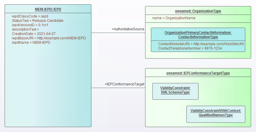 Either of these techniques can then be used to set properties within the IEPConformanceTargetType Object. For example, to set the value of the ValidityConstraintWithContext attribute, create an Object instance of the Class ValidityConstraintWithContextType (which might be an instance of the derived type QualifiedNamesType) and either name it and nest it, or associate it and name the role.