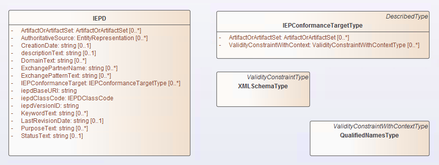 The Package 'NIEM IEDP Types' contains definitions for the Class 'IEPD', as well as a number of other Classes. These other Classes are referenced as classifiers for attributes of the 'IEPD' Class. Relationships between the various Classes defined in this Package can be viewed on the diagram 'NIEM-UML IEPD Types'.