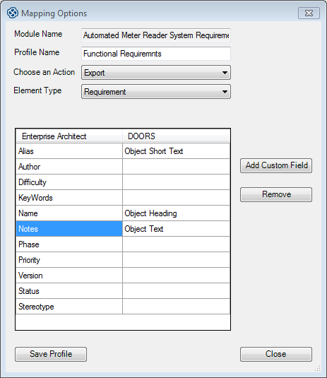 As part of this process you can create an export profile to define what the export should operate on. An export profile is a template in which you specify the Enterprise Architect element properties to be exported to the mapped fields in DOORS object properties.