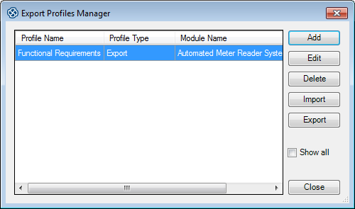 When you click on the on the 'Export to DOORS' dialog, the 'Export Profiles Manager' dialog displays. You use this dialog to create or import new profiles, edit or delete existing profiles, and export profiles to your preferred file system.